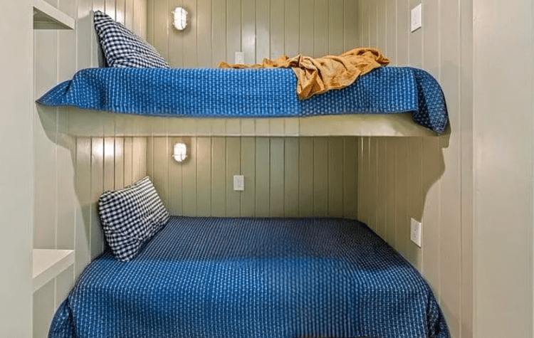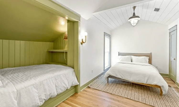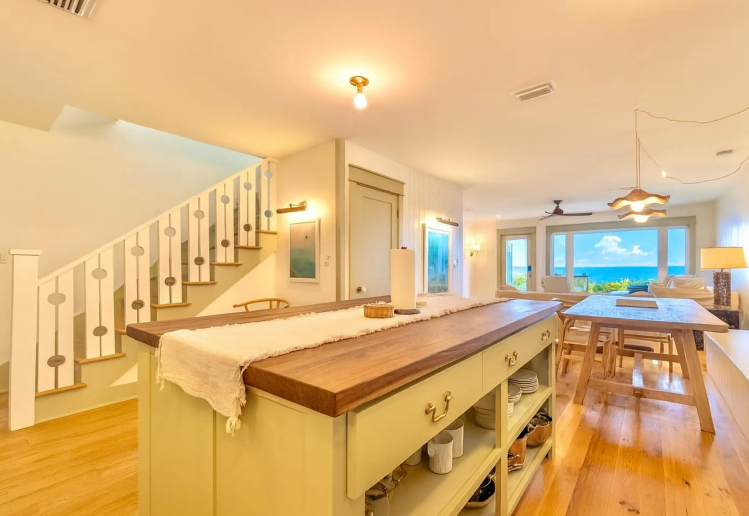 The open concept plan boasts a coastal chic living room, dining room and kitchen on the main floor, in addition to a hallway bunk and a half bathroom. An inviting porch off the living room invites you to enjoy incredible sunrises and sunsets, not to mention access to a full day of playing at the beach.