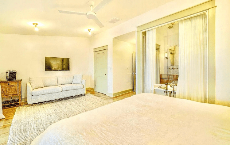 The second floor hosts the master suite and guest suite. Relaxation awaits in the beautiful, oversized master suite with ample sunlight from two sets of sliding doors that lead to the balcony. The master bathroom features a claw foot soaking tub, shower and double vanity complete with marble countertops and floors. The guest suite features a vaulted ceiling and generous space for guests to unwind. The guest bathroom includes an oversized shower with multiple shower heads.